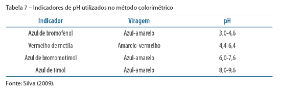 Utilizam indicadores ácido-base na forma de fitas ou soluções que mudam de cor pela atividade do íon H+ (Tabela 7). São métodos rápidos, apresentando apenas o inconveniente de ser pouco precisos.