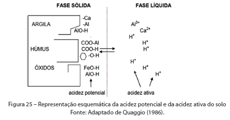 É a acidez devida à concentração de íons de hidrogênio (H+) que se encontram livres ou dissociados na solução do solo, fase líquida (Figura 25).