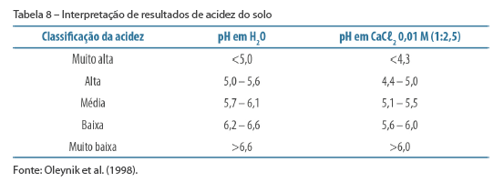 A Tabela 8 apresenta a interpretação dos resultados de acidez do solo para os dois métodos de análise.