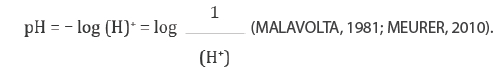 Como ela representa íons na fase líquida, a atividade de H+ muito baixa, como por exemplo, pHCaCℓ2 = 4,0 que corresponderia a uma atividade de íons H+ na fase líquida igual a 0,0001 mol L-1 (QUAGGIO, 1986; RAIJ et al., 2001; MEURER, 2010).