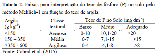 Além da recomendação com base nos teores de P-remanescente, também existe a possibilidade de se considerar os teores de argila do solo (Tabela 2), como sugere Cabral et al. (2015). Essa adequação na classificação do teor de P no solo pode reduzir o uso de fertilizante fosfatado.