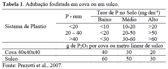 Em relação as quantidades de fertilizantes fosfatados, a recomendação de adubação para plantio tem sido realizada com base na análise de solo (Tabela 1).
