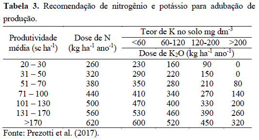 Consultores autônomos têm recomendado adubação com base na fase adulta da planta. Nesta fase, comumente a recomendação de adubação de produção é baseada na análise de solo e na produtividade esperada (Tabela 3), devendo ser ajustada com auxílio de análise foliar e a quantidade de nutrientes exportados pela planta (Tabela 4).