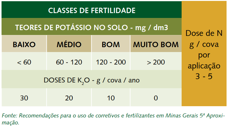 A dose de potássio e de nitrogênio a ser fornecida via adubação é indicada em tabelas da 5ª Aproximação, interpretadas e recomendadas por um técnico.