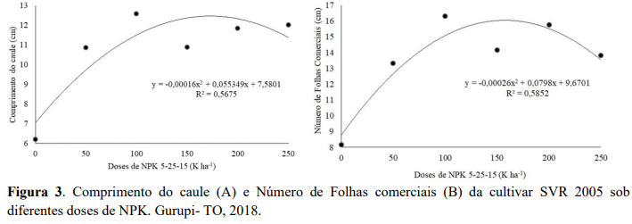 Observou-se para a característica número de folhas comerciais uma variação de 8,17 a 16,33 folhas sob as diferentes doses de NPK, com maior incremento na dose de 150,7 kg ha-1 (Figura 3B). Já as doses acima de 200 kg ha-1 , contribuíram para a redução nos valores do número de folhas comerciais e totais, resultado semelhante foi encontrado por Araújo et al. (2011). Segundo Filgueira (2003) o fornecimento de doses adequadas de N favorece o crescimento vegetativo, expande a área fotossintética e eleva o potencial produtivo da cultura.