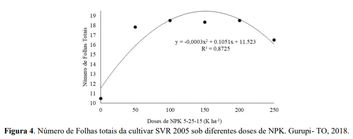 Para a variável número de folhas totais observou-se uma variação de 11 a 19 folhas nas diferentes doses de NPK, com ponto de máximo na dose de 150,5 kg ha-1 com 19,4 de folhas (Figura 4). O número de folhas é uma característica genética que pode ser afetada pelo ambiente, podendo ser essa a razão pela qual houve redução na quantidade das mesmas Falconer (1987).