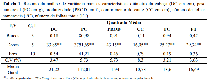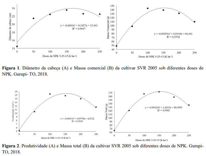 A produtividade comercial de 14,5 t ha-1 foi observada na dose de 157,4 kg de NPK. Doses acima de 200 kg ha-1 resultaram em redução de incrementos para todas as características avaliadas. Segundo Filgueira (2003) o fornecimento em excesso de doses de N pode ocasionar queima das folhas em plantas novas, aumentar a susceptibilidade a doenças, deixar os tecidos mais frágeis e sujeitos a danos mecânicos, dificultar a absorção de outros nutrientes, prolongar o ciclo da cultura e retardar a colheita diminuindo a qualidade do produto. O diâmetro de cabeça teve uma melhor resposta na dose ajustada de 172,9 kg ha-1 de NPK (5-25- 15) nas condições avaliadas.