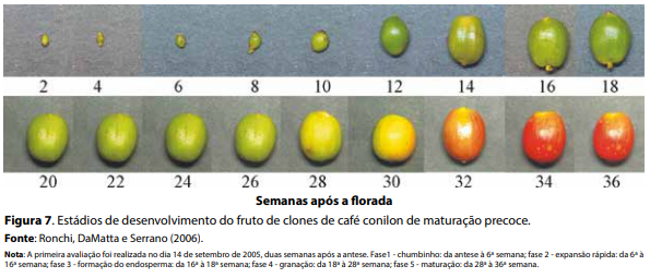 Considerando que o crescimento do fruto do café conilon se dá em cinco fases distintas, semelhantemente às daquelas para o café arábica, para cafeeiros de maturação precoce, elas teriam a seguinte duração (Figuras 6 e 7): fase 1 - estádio de chumbinho: da florada até a sexta semana seguinte duração de oito semanas; fase 2 - crescimento rápido: da sexta à 16ª semana após a florada – duração de dez semanas; fase 3 - crescimento suspenso: da 16ª à 18ª semana após a florada – duração de duas semanas; fase 4 - granação: da 18ª à 28ª semana após a florada – duração de dez semanas; e fase 5 - maturação: da 28ª à 36ª semana após a florada – duração de oito semanas (RONCHI; DaMATTA; SERRANO, 2006). É importante ressaltar, contudo, que a transição entre fases é um processo contínuo (não abrupto) e, portanto, os limites inferiores e superiores ora definidos para cada fase são valores aproximados.