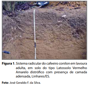 Trabalhos recentes, realizados ao longo de vários anos no Município de Vila Valério, região norte do Espírito Santo produtora de café conilon, apontaram que, apesar de a produtividade de plantas propagadas por estacas ser maior que aquelas propagadas por sementes, ambas as formas de propagação originaram sistemas radiculares semelhantes (PARTELLI et al., 2006, 2014b). Portanto, o sistema radicular do café conilon, principalmente as raízes absorventes (menores que 1,0 mm de diâmetro), avaliado por meio da área, comprimento e volume de raízes por volume de solo, seja em plantas oriundas de propagação vegetativa ou seminífera, concentra-se na camada superficial do solo: de 40% a 50% até 0,1 m e de 60% a 65% até 0,2 m de profundidade (Figuras 1 e 2), com padrão marcante de redução, à medida que se aprofunda no perfil do solo (PARTELLI et al., 2006; 2014b). Essa redução é explicada, parcialmente, pela menor concentração de alguns macronutrientes em profundidade (PARTELLI et al., 2014b). Em todo o caso, na principal região produtora de café conilon do norte do Estado do Espírito Santo, em que predomina solo do tipo Latossolo Vermelho Amarelo distrófico (LVd11), com presença de camada adensada subsuperficialmente, o sistema radicular pode concentrar-se na camada de 0-0,45 m de profundidade, apesar de uma pequena quantidade de raízes conseguir penetrar a camada adensada (SILVA et al., dados não publicados) (Figura 1).