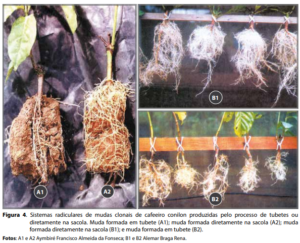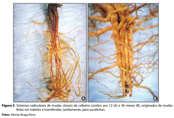 Em mudas clonais formadas em viveiro, Covre et al. (2013) constataram que todos os clones que compõem a cultivar de café conilon ‘Vitória Incaper 8142’ apresentaram sistemas radiculares semelhantes quando eles foram avaliados pelo diâmetro médio ponderado e pelo volume de raízes. Todavia, os clones V3, V8 e V10 destacaramse dentre os demais quanto à área superficial de raízes. Constata-se, portanto, que variações morfológicas dos sistemas radiculares de diferentes clones de café conilon podem ou não ocorrer dependendo da variável utilizada para sua quantificação. Isso também ocorre para o café arábica, assim como marcante variação entre cultivares (RONCHI et al., 2015b).