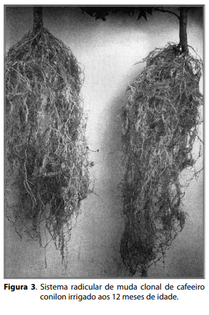 O volume, a área superficial, o comprimento e a quantidade de matéria seca de raízes de café conilon podem variar conforme o clone utilizado. Nesse contexto, Pinheiro et al. (2005) verificaram que a produção de massa seca de raízes por planta de café conilon com dez meses de idade, cultivada sem restrição hídrica, em vasos de 120 L, foi de 0,176; 0,187; 0,351 e 0,268 kg para os clones 14, 46, 109A e 120, respectivamente. É importante ressaltar que maior quantidade de massa seca de raízes não está, necessariamente, associada a maiores profundidades do sistema radicular. Por exemplo, nesse trabalho de Pinheiro et al. (2005), a profundidade média foi de 0,75 m nos clones 14 e 120, e de aproximadamente 0,50 m nos clones 46 e 109A. Esses resultados foram confirmados posteriormente por Silva et al. (2010) para os clones 120 e 109A, também cultivados em vasos. Esse conhecimento sobre o sistema radicular é importante, pois numa situação de deficit hídrico, o retardamento da desidratação, associado à profundidade, e não à matéria seca per se do sistema radicular, pode garantir maior tolerância à seca a alguns materiais genéticos.