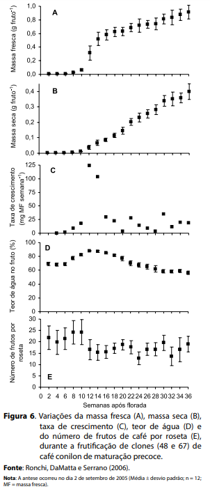 O período de crescimento ou desenvolvimento dos frutos é geralmente dividido, em café arábica, em cinco fases: fase 1 - chumbinho; fase 2 - expansão rápida; fase 3 - formação do endosperma; fase 4 - endurecimento do endosperma (granação); e fase 5 - maturação dos frutos. Essa divisão também pode ser aplicada ao café conilon. O padrão de crescimento segue, na maioria das vezes, um modelo sigmoidal duplo (LEON; FOURNIER, 1962; SALAZAR-GUTIÉRREZ et al., 1994), mas pode variar, dependendo das condições climáticas e da altitude (LAVIOLA et al., 2007), das variáveis utilizadas para medir o crescimento do fruto (e.g., comprimento, diâmetro, volume, massas seca e fresca), da frequência de medições, dos modelos estatísticos e das espécies (WORMER, 1964; SALAZAR-GUTIÉRREZ et al., 1994). Em café robusta, por exemplo, existem divergências quanto ao tipo de curva utilizado para caracterizar o crescimento de frutos nos poucos trabalhos publicados com essa espécie, no mundo (DANCER, 1964; RAMALAH; VASUDEVA, 1969; OYEBADE, 1976; SRINIVASAN; RAJU; VISHVESHWARA, 1978), apesar de Rena, Barros e Maestri (2001) sugerirem que o padrão sigmoidal seja comum a ambas as espécies, café arábica e robusta. Especificamente para o café conilon, Silveira (1996) verificou que o crescimento de frutos, com base no acúmulo de massa seca, seguiu o modelo sigmoidal duplo, quando cultivado sem irrigação, e o sigmoidal simples, quando irrigado. Recentemente, Partelli et al. (2014c) encontraram um padrão sigmoidal simples para o acúmulo de matéria seca de frutos de café conilon de maturação precoce (clone 12 V), intermediária (clone 10 V) e tardia (clone 13 V). Ademais, de forma geral, pode-se afirmar que a curva de acúmulo de macronutrientes pelos frutos desses clones seguiu um padrão similar ao daquele da matéria seca.