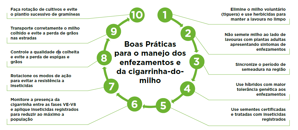 A seguir, listamos 10 medidas que devem ser adotadas para reduzir a população da cigarrinha-do-milho, a multiplicação dos molicutes e minimizar os riscos de alta incidência dos enfezamentos nas propriedades e em nível regional.
