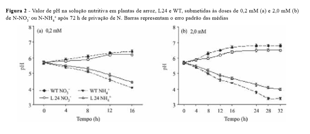 O pH da solução nutritiva foi monitorado a partir do momento em que foram aplicados os tratamentos. A L24 mostrou diminuição na capacidade de acidificação da solução quando conduzida com 0,2 e 2,0 mM de NNH4+. Também foi observada uma menor capacidade de alcalinização da solução quando as plantas foram submetidas a 0,2 e 2,0 mM de N-NO3- (Figura 2).