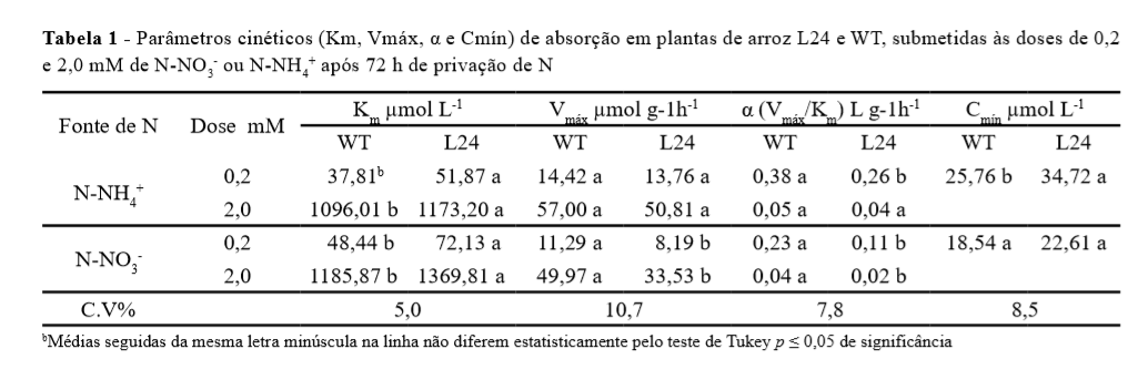 A Vmáx variou pouco entre L24 e WT (Tabela 1). Apenas nos tratamentos com N-NO3-, observou-se redução da Vmáx em L24 que pode ser reflexo de uma menor quantidade de proteínas de transporte para este ânion. Esta é uma característica desfavorável, uma vez que plantas que apresentam menor Vmáx mostram redução na capacidade de transporte de nutrientes (SANTOS et al., 2011).