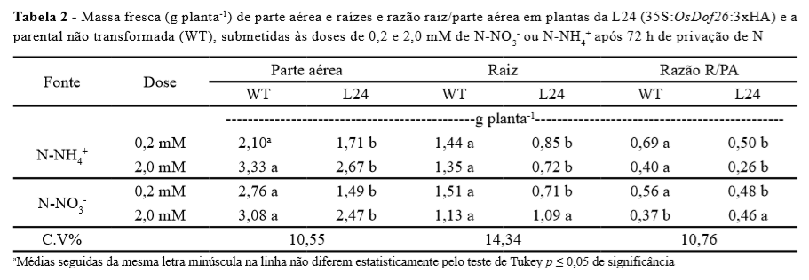 1.Plantas de arroz superexpressando o fator de transcrição OsDof26, L24, mostram menor massa fresca de parte aérea e raiz independente da dose e fonte de N aplicado;