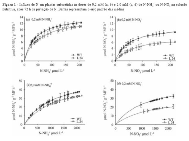O Cmín representa a concentração do nutriente em solução onde o influxo líquido é igual a zero e seu valor pode variar consideravelmente entre espécies de plantas e em diferentes condições ambientais (HU et al., 2010). Foram encontrados os valores de 25,76 e 34,72 µmol L-1 para a WT e L24, respectivamente. Este resultado, mais uma vez, indica que L24 mostrou menor capacidade de absorver o N da solução nutritiva.