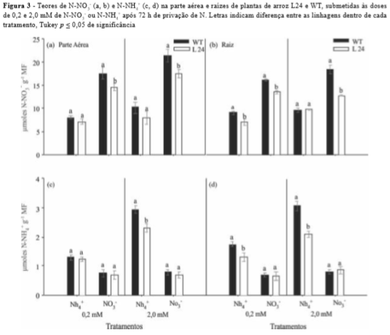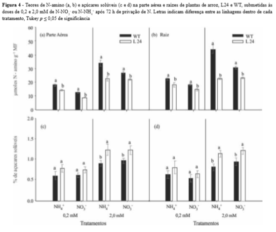 O maior teor de açúcares solúveis observado em L24 sugere uma menor capacidade destas plantas em incorporar o N absorvido em esqueletos de C, afetando Figura 4 - Teores de N-amino (a, b) e açúcares solúveis (c e d) na parte aérea e raízes de plantas de arroz, L24 e WT, submetidas às doses de 0,2 e 2,0 mM de N-NO3- ou N-NH4+ após 72 h de privação de N. Letras indicam diferença entre as linhagens dentro de cada tratamento, Tukey p 0,05 de significância assim a formação de aminoácidos essenciais para o desenvolvimento do vegetal.
