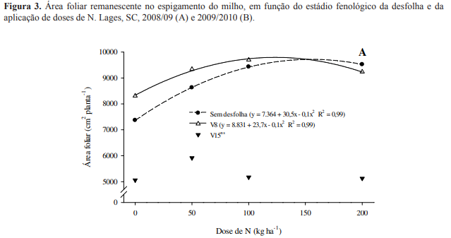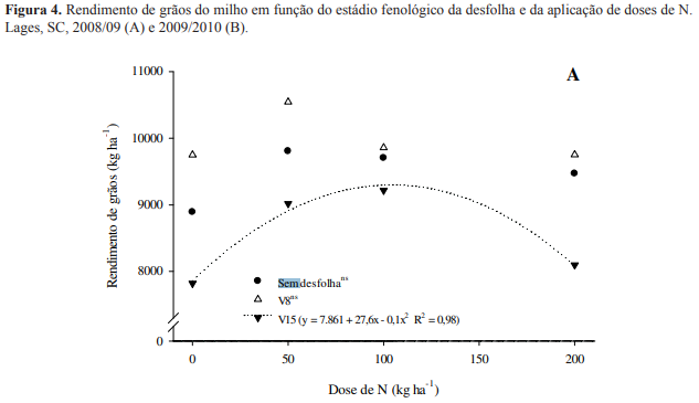 Em 2008/2009 não houve efeito da dose de N sobre o rendimento de grãos do milho na testemunha não desfolhada e quando a desfolha foi imposta em V8(Figura 4A). Isto provavelmente ocorreu em função da alta disponibilidade de N no sistema decorrente do teor elevado de matéria orgânica do Nitossolo em que se conduziu o trabalho (51,0 g kg-1) e dos 80 kg de nitrogênio mineral que foram aplicados (30 kg na semeadura e 50 kg em V4) previamente à realização dos tratamentos de desfolha. Por outro lado, a dose de N interferiu na produtividade do milho quando as plantas foram desfolhadas em V15. Observouse uma resposta quadrática do rendimento de grãos à dose de N aplicada neste estádio. A dose que maximizou a resposta foi de 106 kg de N ha-1. Não houve diferença significativa de rendimento entre as subparcelas desfolhadas em V15 e aquelas onde as folhas foram preservadas, quando se reaplicou a dose de 100 kg ha-1 de N (Tabela 2). Neste caso, o N auxiliou na recuperação do milho submetido ao estresse por desfolha. Isto possivelmente aconteceu por que o a aplicação de nitrogênio aumentou a eficiência fotossintética das folhas que se expandiram após a desfolha, visto que a área foliar remanescente no florescimento não foi afetada pela quantidade de N aplicada quando a remoção foi feita em V15 (Figura 3A). A taxa fotossintética é influenciada pelo estado nutricional do milho, sendo que maiores taxas fotossintéticas líquidas estão diretamente relacionadas à concentração de N no tecido foliar (AITA et al., 2001).