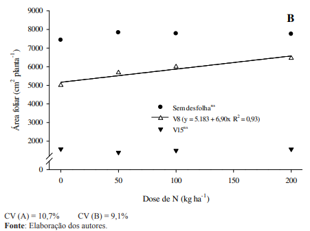 Nos dois anos agrícolas, a área foliar remanescente no espigamento foi influenciada pela dose de N aplicada quando a desfolha foi realizada em V8. Em 2008/2009 houve efeito quadrático da dose sobre esta variável, sendo a maior área foliar alcançada com a dose de 119 kg de N ha-1 (Figura 3A). Já em 2009/2010 houve um incremento linear de 6,9 cm² por kg de nitrogênio aplicado (Figura 3B). O incremento da área foliar remanescente no florescimento pela aplicação de doses crescentes de nitrogênio após a desfolha em V8 pode ter duas causas. A primeira é a retardamento da senescência das folhas, pois a nutrição adequada, especialmente a nitrogenada, propicia às plantas melhores condições de crescimento e desenvolvimento do tecido foliar, reduzindo os efeitos da deficiência deste nutriente sobre a senescência (WOLSCHICK et al., 2003). Além disto, o nitrogênio possivelmente teve um efeito estimulante na regeneração da área foliar das plantas desfolhadas precocemente, confirmando a hipótese que originou o trabalho. Por outro lado, não houve efeito da dose de N sobre a área foliar remanescente na floração quando a desfolha foi imposta em V15. Neste estádio fenológico, o impacto do nitrogênio sobre a divisão e elongação celular nas folhas é potencialmente menor do que em V8, pois a maior parte das folhas produzidas pela planta já estava expandida quando o nutriente foi aplicado (SANGOI et al., 2010).