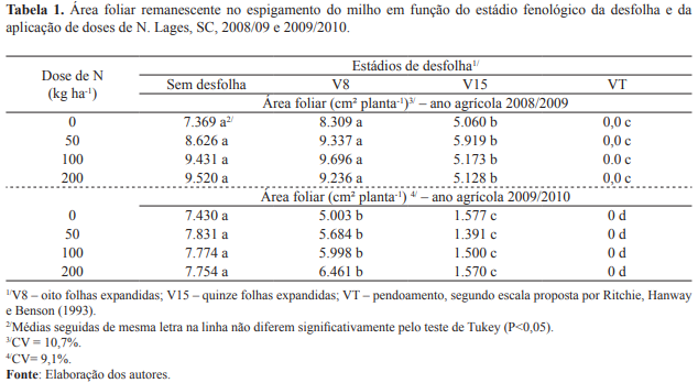 Nos dois anos em que se conduziu o trabalho, a área foliar remanescente no espigamento foi afetada pela interação entre o estádio do milho em que ocorreu a desfolha e a dose de N aplicada em cobertura. Em 2008/2009, a desfolha realizada em V8 não reduziu a área foliar, em relação às subparcelas não desfolhadas, independentemente da dose de N aplicada (Tabela 1). A ausência de diferença entre a área foliar nas subparcelas desfolhadas em V8 e naquelas não desfolhadas no primeiro ano deveu-se à senescência natural que ocorreu nas folhas inferiores do híbrido AS 1570 com o avanço do desenvolvimento. Observouse durante o espigamento que as subparcelas que não foram desfolhadas tinham um número similar de folhas verdes ao das subparcelas desfolhadas em V8. Isto indica que as oito primeiras folhas da planta senesceram naturalmente até o florescimento das subparcelas não desfolhadas. Já em 2009/2010, a desfolha realizada em V8 reduziu a área foliar, em relação às parcelas não desfolhadas, independentemente da dose de N aplicada.