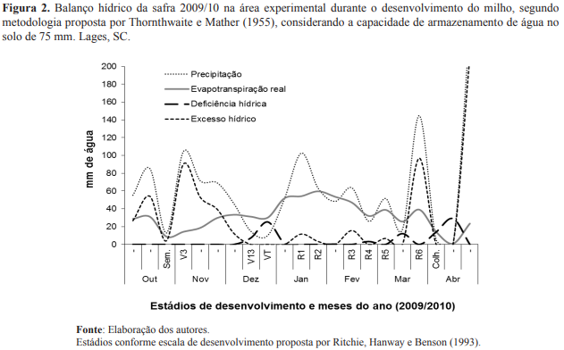 As precipitações pluviais do ano agrícola 2009/2010 foram relativamente bem distribuídas situando-se ao redor de 61 mm por decêndio (Figura 2). No início de desenvolvimento e no final do ciclo da cultura houve excesso hídrico, superior a 80 mm. No segundo e terceiro decêndios de dezembro observou-se uma deficiência hídrica de aproximadamente 20 mm. Esta ocorreu num curto período de tempo, em que a cultura se encontrava entre os estádios V15 e VT da escala de Ritchie, Hanway e Benson (1993).