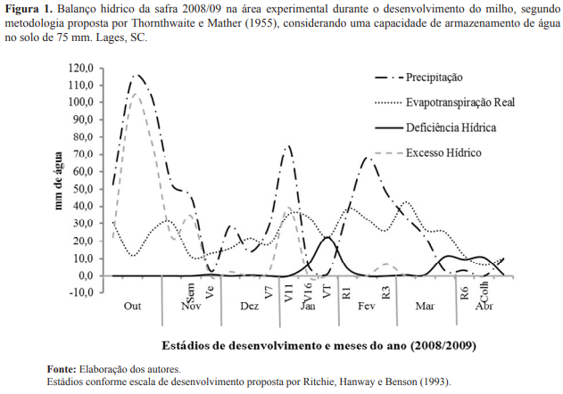 Os dados pluviométricos de 2008/2009 mostram que houve excesso hídrico, superior a 30 mm, no início do desenvolvimento do milho (Figura 1). Já na fase vegetativa, as precipitações foram relativamente bem distribuídas. O período compreendido entre meados de janeiro e início do mês de fevereiro apresentou deficiência hídrica de 22 mm de água. Este déficit hídrico coincidiu com o pendoamento e o espigamento da cultura, que ocorreram no último decêndio de janeiro.