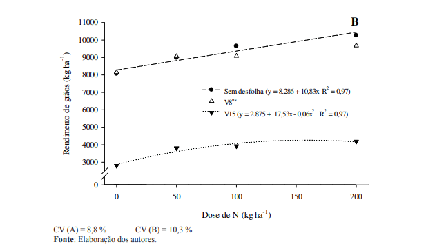 Considerando os prejuízos potenciais ocasionados pela desfolha e a necessidade de buscar alternativas para minimizá-los, este trabalho teve como objetivo avaliar o efeito da aplicação de doses crescentes de nitrogênio em cobertura sobre o rendimento de grãos do milho submetido à desfolha em diferentes estádios fenológicos.