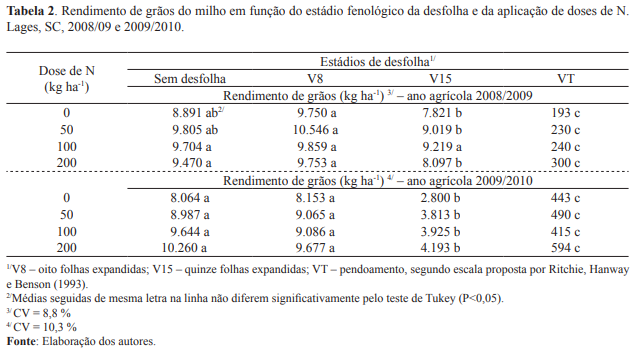 O rendimento de grãos de milho foi afetado pela interação entre época de realização da desfolha e dose de nitrogênio aplicada em cobertura nos dois anos em que se conduziu o trabalho. Não foram detectadas diferenças entre o rendimento de grãos das unidades experimentais não desfolhadas e daquelas em que as oito primeiras folhas expandidas do milho foram removidas, independentemente da dose de N utilizada (Tabela 2). Isto demonstra que as oito primeiras folhas produzidas pela planta foram pouco importantes para a produtividade do milho. Comportamento similar foi reportado por Lauer, Roth e Bertram (2004) e Tsukahara e Kochinski (2008), que não verificaram reduções significativas no rendimento de grãos quando as desfolhas ocorreram na fase inicial do desenvolvimento do milho.