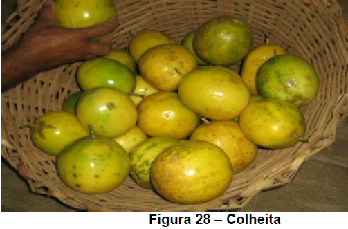 Quando o fruto completa o seu desenvolvimento, o que ocorre 60 a 80 dias após o florescimento, ele se desprende da planta, sendo que a colheita (Figura 28) consiste em retirar manualmente o fruto da planta antes que ocorra seu desprendimento da planta.
