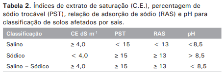 A condutividade elétrica do extrato da pasta saturada, mais conhecida como condutividade elétrica do extrato de saturação (C.E.) é o método mais rápido e simples para se estimar o total de sais solúveis do solo. A percentagem de sódio trocável (PST) é o percentual de Na+ em relação à capacidade total de troca de cátions é obtida pela fórmula: PST = (Na+/CTC potencial) *100. A relação de adsorção de sódio (RAS) é a relação entre as concentrações de Na+ e as concentrações dos íons divalentes Ca2+ e Mg2+, expressas em mmol L-1, no extrato de saturação do solo e é calculada pela fórmula: RAS = / [(Ca2+ + Mg2+)/2]1/2.