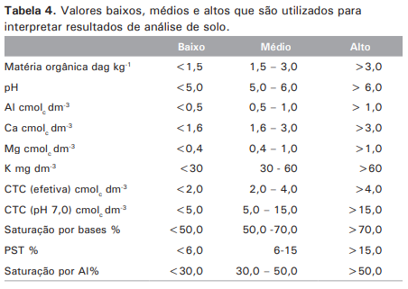 Na Tabela 4, são mostrados os valores que são utilizados para interpretar resultados de análise de solo utilizando-se os métodos da rede Embrapa de Laboratórios.