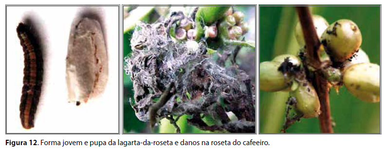 As lagartas apresentam coloração castanho-escura e vivem reunidas em pequenos grupos tecendo pequena teia de seda entre os frutos e sobre as rosetas do café conilon; chegam a emaranhar os resíduos remanescentes da floração (Figura 12). Atingem de 10 a 11 mm de comprimento. Os adultos são pequenas mariposas de 7,5 a 8 mm de envergadura, de cor predominante cinza-escura.