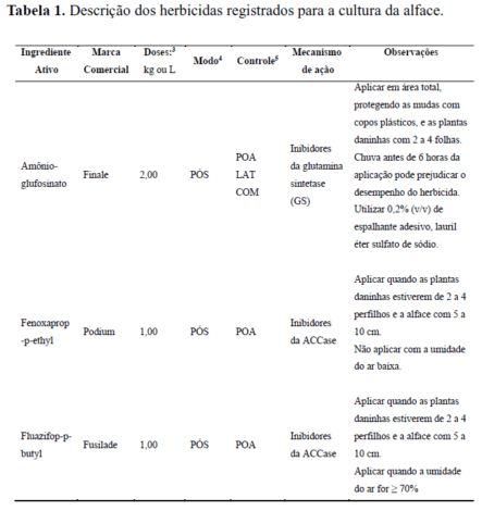 Algumas características referentes ao uso dos ingredientes ativos registrados para o controle de plantas daninhas na cultura da alface no Brasil e sua respectiva identificação comercial e observações relevantes de uso estão disponíveis na Tabela 1.