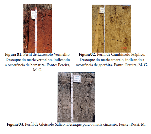 Vale ressaltar que, em solos mal drenados e em condições de hidromorfismo, quando há o domínio do ferro na forma reduzida (Fe2+), a cor do solo é acinzentada ou adquire matiz neutro (Figura 03). Esta morfologia não é devida a cor do elemento ferro, que se encontra em forma solúvel (Fe2+), mas sim pela cor de outros materiais de solo, que ocorrem na matriz do solo e apresentam as seguintes colorações: