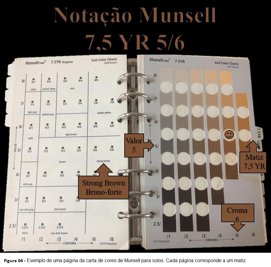A caracterização da cor do solo, ou dos seus horizontes, segue padrão mundial que representa o grau de intensidade de três componentes da cor: matiz, valor e croma; conforme especificações constantes na Carta de Cores Munsell para Solos (Munsell Soil Color Charts).
