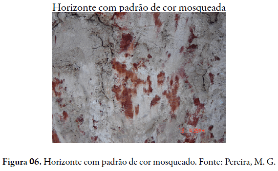 Alguns horizontes podem estar mesclados e apresentarem mais que uma cor. Este padrão recebe o nome de mosqueado (Figura 06), se existe uma cor dominante (cor de fundo), ou seja, que ocorre em mais de 50% do horizonte, ou do contrário o padrão é variegado. A notação é feita do seguinte modo: cor de fundo e cor ou cores das manchas existentes, e arranjamento do mosqueado. Ex.: Bruno-claro acinzentado (10YR 6/4, úmido) com mosqueado pouco médio e proeminente amarelo-brunado (10YR 6/6).