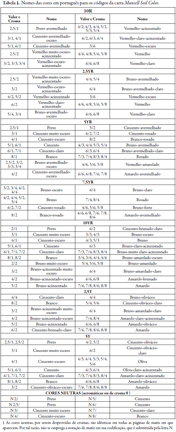d) Na página adjacente à que contêm os padrões de cores, é determinado o nome da cor em inglês. A designação da cor em português é feita de acordo com tradução padronizada pela SBCS, no Manual de Descrição e Coleta de Solo no Campo (Santos et al., 2015) ou no Manual Técnico de Pedologia (IBGE, 2015) (Tabela 01);