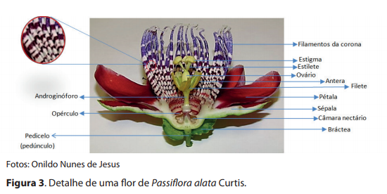 Nas plantas do gênero Passiflora as flores são hermafroditas, grandes, vistosas com diferentes colorações (branca, rosa, magenta, diferentes tons de vermelho, azul ou roxa) (JESUS et al., 2015a; 2015b) e protegidas na base por brácteas foliares. A corona formada por vários filamentos ou fímbrias é sem dúvida a marca característica do gênero Passiflora, sua origem vem sendo investigada durante muitos anos e acredita-se ser derivada de sépalas e pétalas, e não de estames (Figura 3). No centro da flor, existe o androginóforo colunar bem desenvolvido com o ovário globoso, unilocular e multiovulado. A estrutura feminina tem três estiletes livres ou conectados na base, com estigmas capitados. A estrutura masculina é formada por cinco estames, com filetes livres ou conectados na base com anteras dorsofixas e versáteis. Dependendo da espécie, a abertura da flor pode ser no período matutino, vespertino ou noturno, sendo que algumas espécies são sensíveis ao fotoperíodo, ou seja, necessitam de dias mais longos para induzir o florescimento.