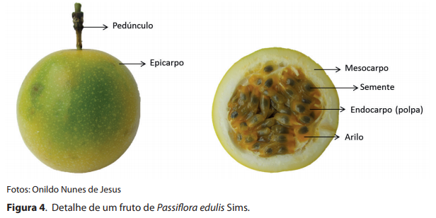 Os frutos do maracujá são usualmente bagas (Figura 4), indeiscentes ou cápsulas deiscentes, apresentando vários formatos (ovalado, oblongo, arredondado, oblato, elipsóide, fusiforme, oboval e periforme) e cores (verde, amarelo, laranja, rosado, vermelho e roxo) (VANDERPLANK, 2000; ULMER; MACDOUGAL, 2004; JESUS et al., 2015a, 2015b). Normalmente, as sementes são comprimidas, reticuladas, pontuadas ou transversalmente alveoladas, envolvidas por um arilo mucilaginoso. São do tipo ortodoxas ou ortodoxas intermediárias (NUNES; QUEIROZ, 2006).