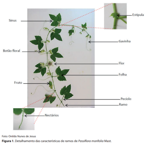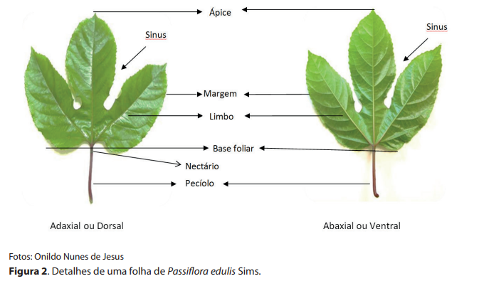 As diferentes espécies comerciais e silvestres do gênero Passiflora exibem uma grande diversidade em formato de folhas (lanceolada, ovada, cordada, oblonga, elíptica, fendida, partida ou seccionada) (JESUS et al., 2015a; 2015b), provavelmente devido à pressão evolutiva entre Passifloras (VANDERPLANK, 2000). Na maioria das espécies as folhas são simples e alternas, elípticas ou orbiculares, inteiras ou lobadas, margem geralmente inteira, base cordada, truncada, arredondada ou cuneada, pecíolo com ou sem glândulas, glândulas peciolares sésseis, estipitadas ou pedunculadas, algumas vezes com glândulas nos lobos dos sinus (Figura 2). Poucas espécies possuem folhas compostas (ULMER; MACDOUGAL, 2004). As gavinhas, geralmente solitárias, desenvolvem-se nas axilas das folhas e são ausentes em espécies lenhosas (CUNHA et al., 2002). As brácteas são pequenas ou foliáceas, verticiladas e involucrais ou alternadas no pedúnculo, algumas vezes decíduas.