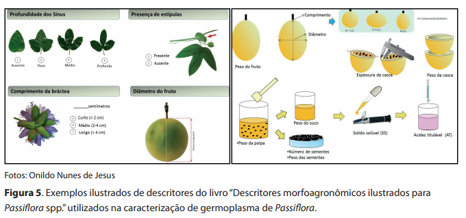 Considerando a importância da caracterização morfológica para coleções de germoplasma ex situ, Jesus et al. (2015a) elaboraram um catálogo descritivo em Passiflora com intuito de padronizar a avaliação dos caracteres morfoagronômicos, em estudos de caracterização de bancos de germoplasmas. Como um dos objetivos da caracterização é facilitar o intercâmbio e a utilização de germoplasma, é fundamental que os descritores morfológicos tenham maior uniformidade possível para que possam ser praticáveis, com fácil manipulação e compreendidos por usuários de todo o mundo (Figura 5).