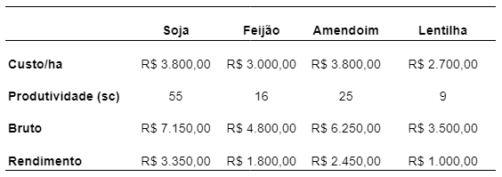 O custo médio para o plantio de um hectare de lentilha é de aproximadamente R$ 2.700, considerando os gastos com sementes, fertilizantes, defensivos agrícolas, mão de obra e outros insumos necessários. Já a produtividade média esperada é de cerca de 8 a 10 sacas por hectare, o que representa um rendimento bruto de aproximadamente R$ 3.200 a R$ 4.000, considerando o preço atual da lentilha.