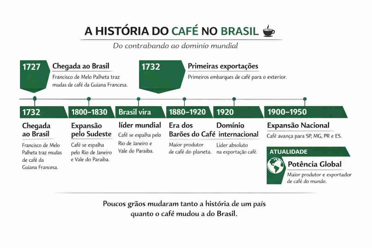 A história do café no Brasil começou oficialmente em 1727, quando Francisco de Melo Palheta trouxe clandestinamente mudas da Guiana Francesa para o estado do Pará. O que parecia um simples transporte de sementes acabou iniciando uma das culturas mais importantes da história econômica brasileira.