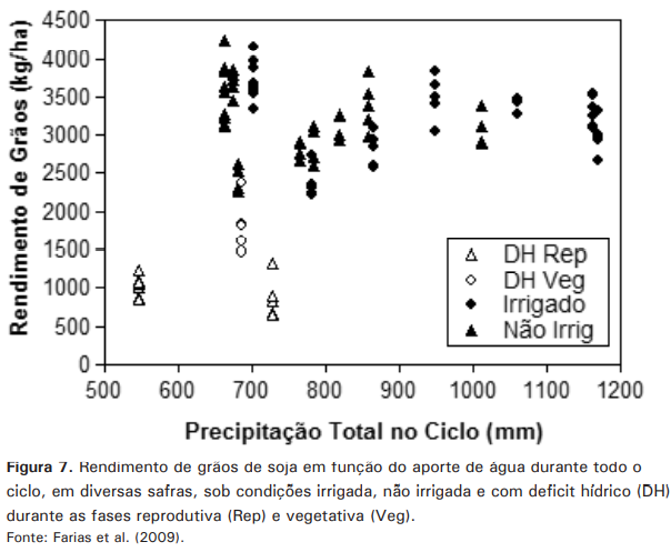 Comparativamente a outras culturas produtoras de grãos, como o milho, por exemplo, a soja é relativamente tolerante ao deficit hídrico na sua fase vegetativa, mas é muito sensível ao estresse durante a formação dos componentes do rendimento, ou seja, florescimento e enchimento de grãos (Sentelhas et al., 2015). Para apresentar bom desempenho produtivo, a soja necessita, além de um volume de água adequado, a adequada distribuição das chuvas ao longo do ciclo, principalmente, durante as fases mais críticas. Em trabalhos realizados em Londrina-PR, ao longo de 15 safras, avaliando-se diversas cultivares sob diferentes condições de disponibilidade hídrica, verificou-se que os maiores rendimentos de grãos de soja foram obtidos com 650 mm a 700 mm de água, desde que bem distribuídos em todo o ciclo (Figura 7). Nos tratamentos em que houve a indução de deficit hídrico durante as fases vegetativa e reprodutiva (Figura 7), apesar do volume total de água durante todo o ciclo ter atingido valores próximos a 700 mm, os rendimentos alcançados não foram tão altos em função da má distribuição da precipitação, principalmente quando o estresse ocorre durante a fase mais crítica (período reprodutivo).