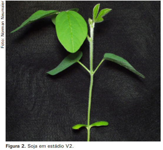 Portanto, uma plântula em V1 apresenta as folhas unifolioladas (opostas, no primeiro nó foliar) (Figura 1B) completamente desenvolvidas, ou seja, as bordas dos folíolos da primeira folha trifoliolada não mais se tocam. De forma semelhante, uma planta em V2 apresenta a primeira folha trifoliolada completamente desenvolvida, isto é, quando as bordas dos folíolos da segunda folha trifoliolada não mais se tocam (Figura 2). E assim, sucessivamente, para V3, V4, V5, V6, ... Vn (Tabela 1).