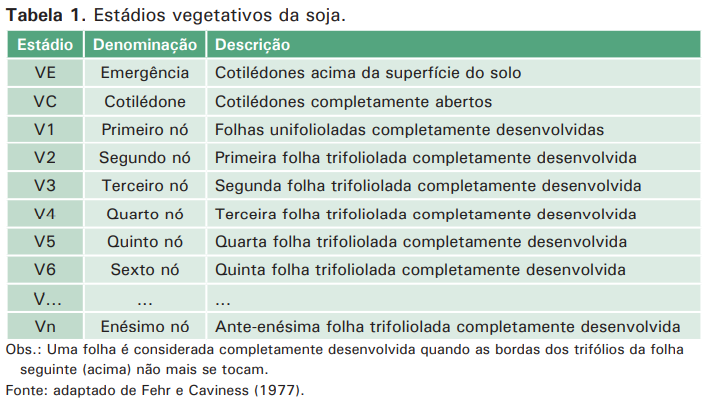 Pela descrição dos estádios fenológicos da soja é possível relacionar o seu desenvolvimento com as necessidades da cultura. Fehr e Caviness (1977) propuseram uma divisão do ciclo da soja em estádios vegetativos (V) e estádios reprodutivos (R) (ver Anexo 1, ao final publicação). Estádios específicos são identificados por números, após o V ou o R. VE (emergência) e VC (cotilédone) são identificados apenas por letras.