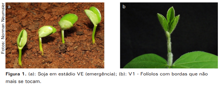 Os estádios vegetativos (V) descrevem e caracterizam o desenvolvimento vegetativo. O primeiro deles é o VE (emergência) e acontece quando os cotilédones estão acima da superfície do solo em um ângulo ≥90° em relação ao hipocótilo (Figura 1A). O segundo estádio vegetativo é o VC, que acontece quando os cotilédones se encontram completamente abertos e expandidos, ou seja, quando as bordas das folhas unifolioladas não mais se tocam.