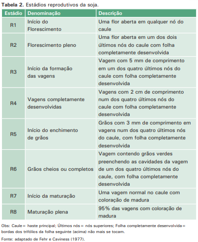 Os estádios reprodutivos (R) descrevem o período florescimento-maturação, com a letra R seguida dos números 1 até 8. O período reprodutivo apresenta quatro fases: florescimento (R1 e R2), desenvolvimento de vagens (R3 e R4), desenvolvimento de grãos (R5 e R6) e maturação da planta (R7 e R8) (Tabela 2).
