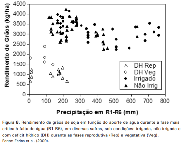 No período reprodutivo (R1-R6), o volume de água ideal para atender as necessidades da cultura da soja situou-se entre 120 mm a 300 mm (Figura 8), adequadamente distribuídos ao longo desse período. Da mesma forma que na Figura 7, observou-se que volumes de água de igual magnitude, porém mal distribuídos, limitaram o rendimento de grãos. Esses dados comprovam que para obtenção de elevadas produtividades, o volume de água necessário deve ser disponibilizado ao longo de todo o ciclo, a fim de atender as exigências da cultura.